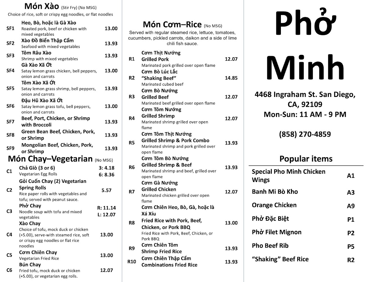 Welcome to Pho Minh - San Diego, a culinary gem nestled in the vibrant Pacific Beach area. This modest yet inviting establishment offers a menu brimming with authentic Vietnamese flavors that delight the senses.